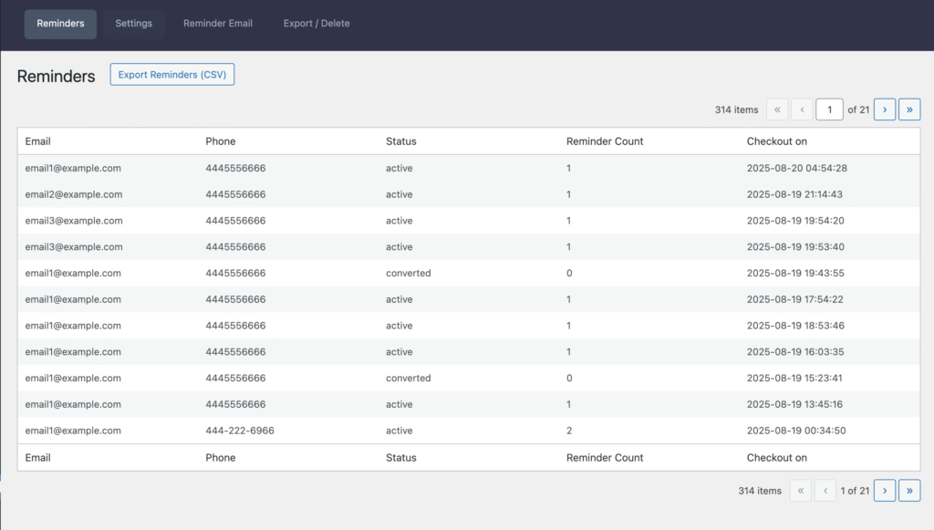This screen lists all captured checkout reminders and their current state. Use it to monitor activity and maintain your reminder dataset.
